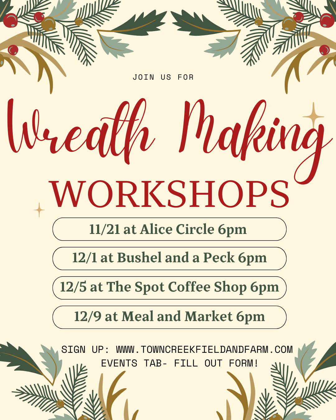 Join us for our Wreath- Making Workshops this season! We will provide all of the materials that you need to create your wreath. Perfect to go on your door or give as a gift! Be sure to fill out the form and specify which date/location you would like to attend! The cost is $45/person. Come get into the holiday spirit with us at one of our wreath-making workshops.